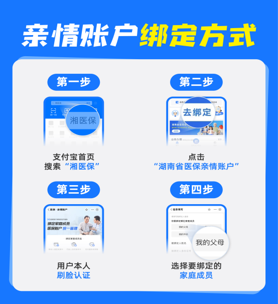 用户只需在支付宝首页搜索并进入“湘医保”,点击“湖南省医保亲情账户”即可为家人绑定。当被绑定家人为16周岁及以下的“小宝贝”时,只需提供以下材料中的一项:1.出生证明 或 2.双方户口页 或 3.双方关系公证书;当被绑定家人为16周岁以上(如老人)时,需核验被绑定人户口页或进行人脸认证。