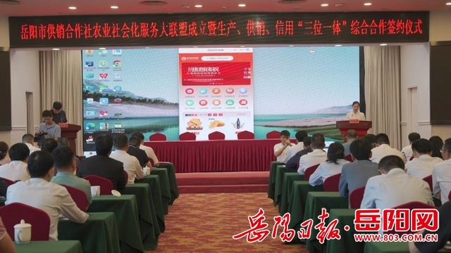 4月19日,岳阳市供销合作社农业社会化服务大联盟成立暨生产、供销、信用“三位一体”综合合作签约启动仪式举行。省供销社党组成员、理事会副主任邓文军出席并讲话,岳阳市人大常委会副主任田文静出席仪式并宣布大联盟成立。市政府办二级巡视员王星耀主持会议。市委改革办等12家市直单位分管负责人,各银行岳阳分行、保险公司、担保公司等参加。