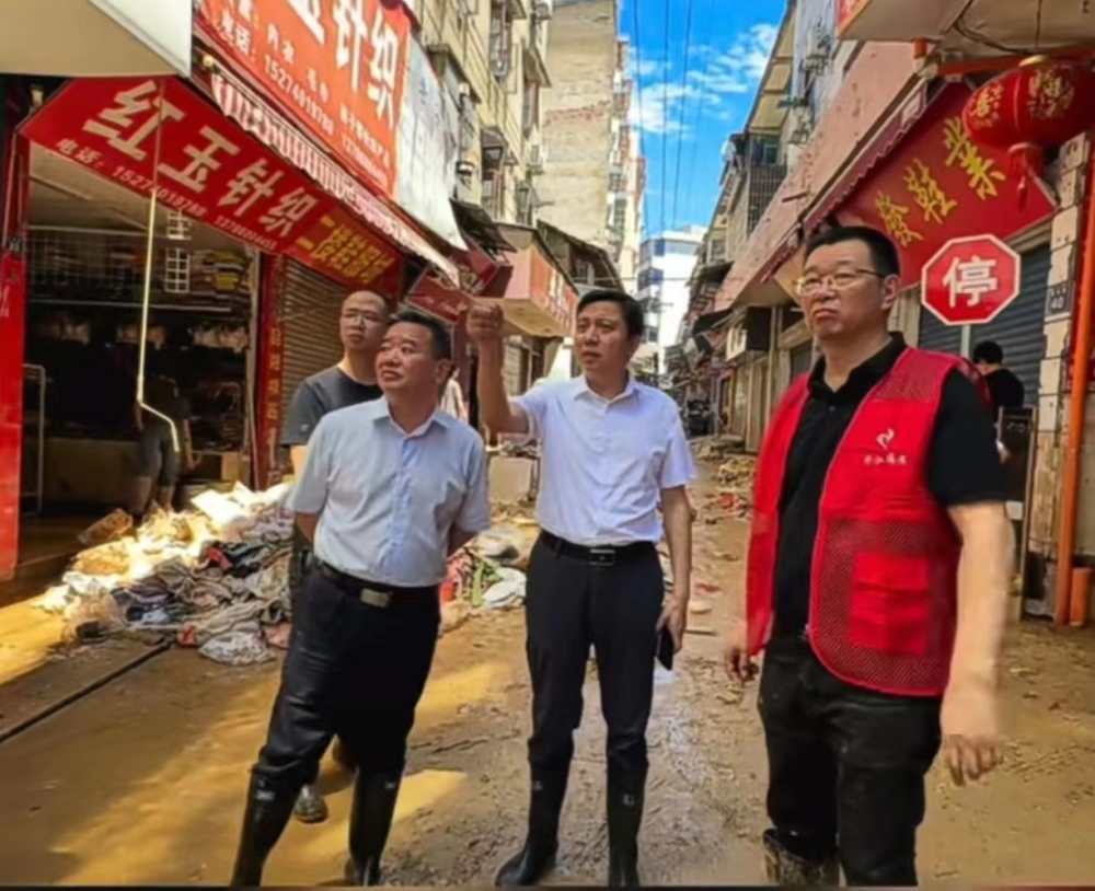 随后,邓文军一行来到平江县农产品批发市场,涉水查看地下层渍水抽排情况,详细了解市场商户受损及农产品保供情况,并代表省社党组、省供销集团、省财贸医院向平江县供销系统捐赠水、方便面、牛奶、消毒液等救灾物资。