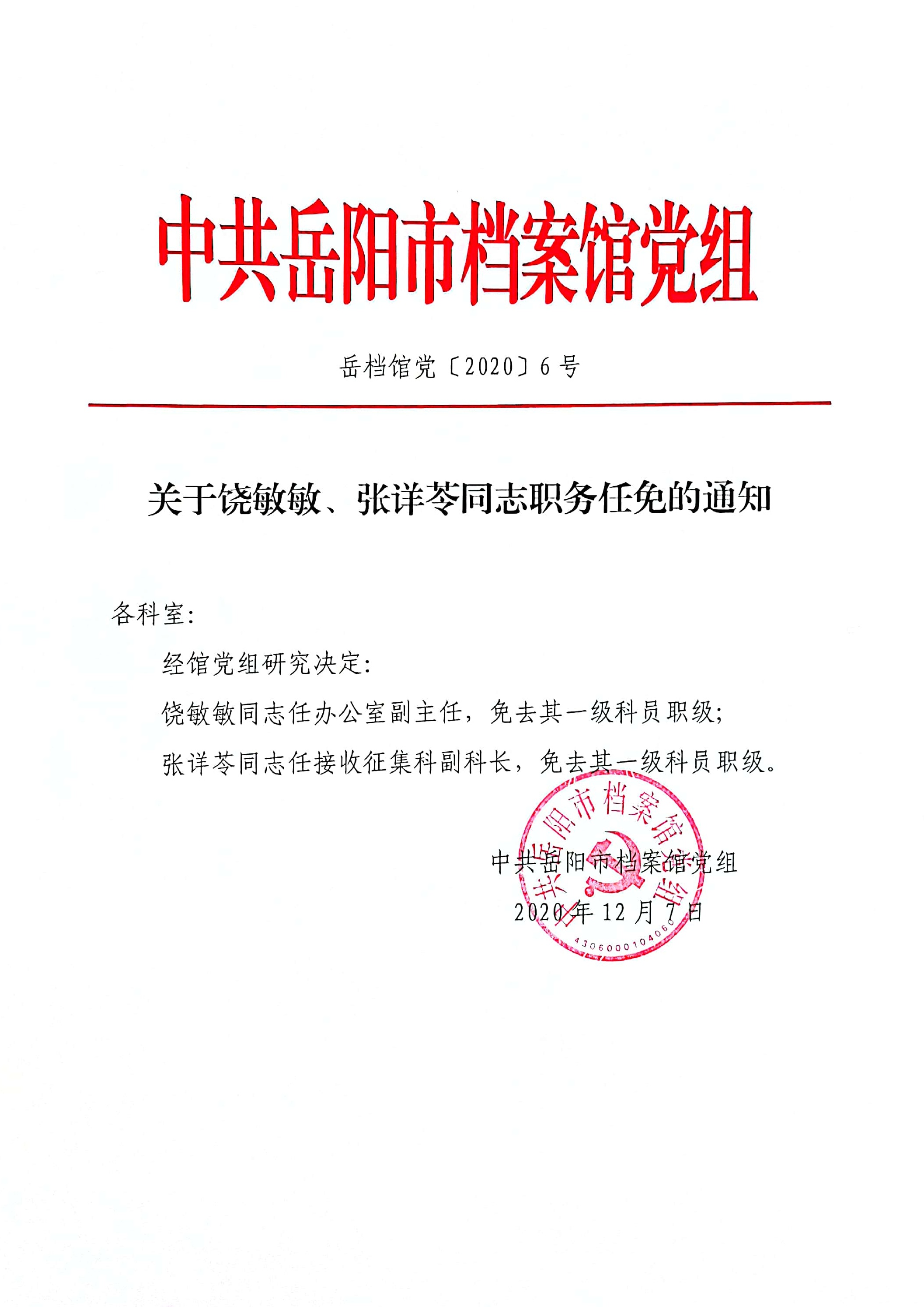 关于饶敏敏、张详苓同志职务任免的通知