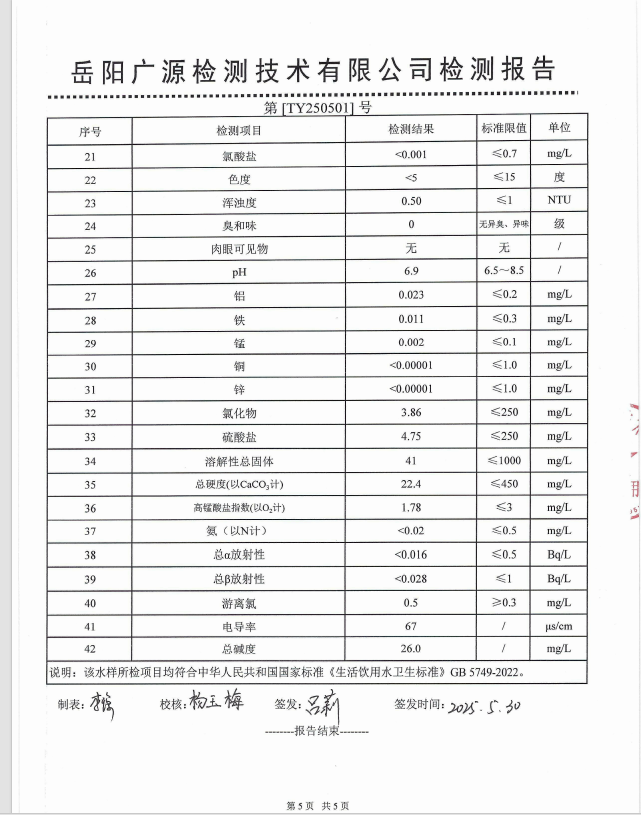 2025年5月岳阳市水务集团出厂水水质检测月报表