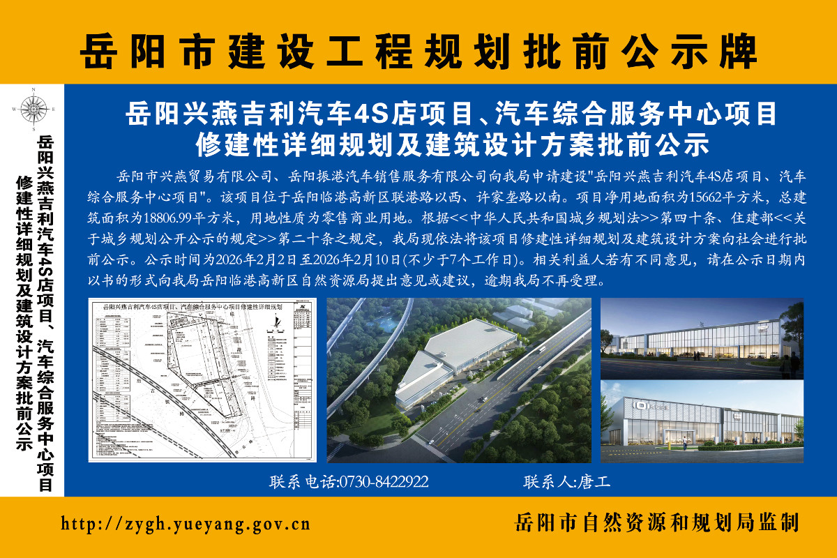岳阳兴燕吉利汽车4S店项目、汽车综合服务中心项目修建性详细规划及建筑设计方案批前公示