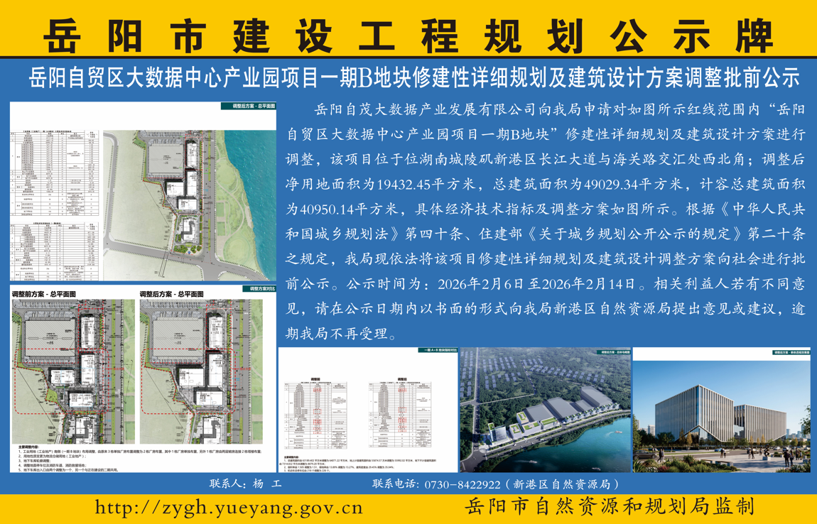 岳阳自贸区大数据中心产业园项目一期B地块修建性详细规划及建筑设计方案调整批前公示
