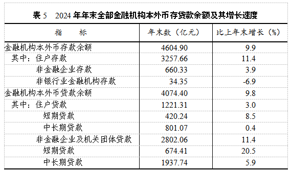 年末全部金融机构本外币各项存款余额4604.90亿元,比上年增长9.9%。其中:住户存款3257.66亿元,增长11.4%;非金融企业存款660.33亿元,增长3.9%;非银行业金融机构存款34.35亿元,下降6.9%。全部金融机构本外币各项贷款余额4074.40亿元,增长9.8%。其中:住户贷款1221.31亿元,增长3.0%;非金融企业及机关团体贷款2802.06亿元,增长11.4%。