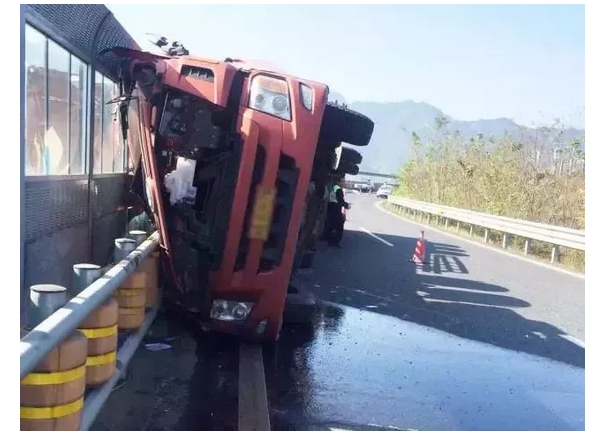 2017年11月,发生在S27东永高速转金丽温高速温州方向匝道口的一幕翻车现场,可见3团重达数吨的钢筋卷翻到在集装箱内,车辆前部严重受损,一半都被压扁,现场护栏外的水泥块散落,护栏受损,护栏为旋转护栏,承受冲击更大,硬生生将车体拦在匝道内,没有下落,经历了4小时的漫长作业后,终于成功施救,所幸无人员受伤。经过调查,事故原因就是疲劳驾驶。