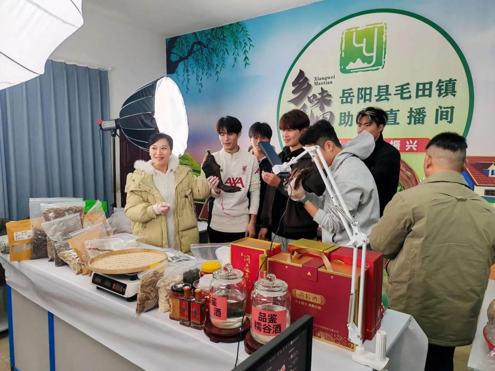 在毛田镇原八斗小学,补光灯亮起,村干部化身主播,乡音透过屏幕将山货卖向全国;
