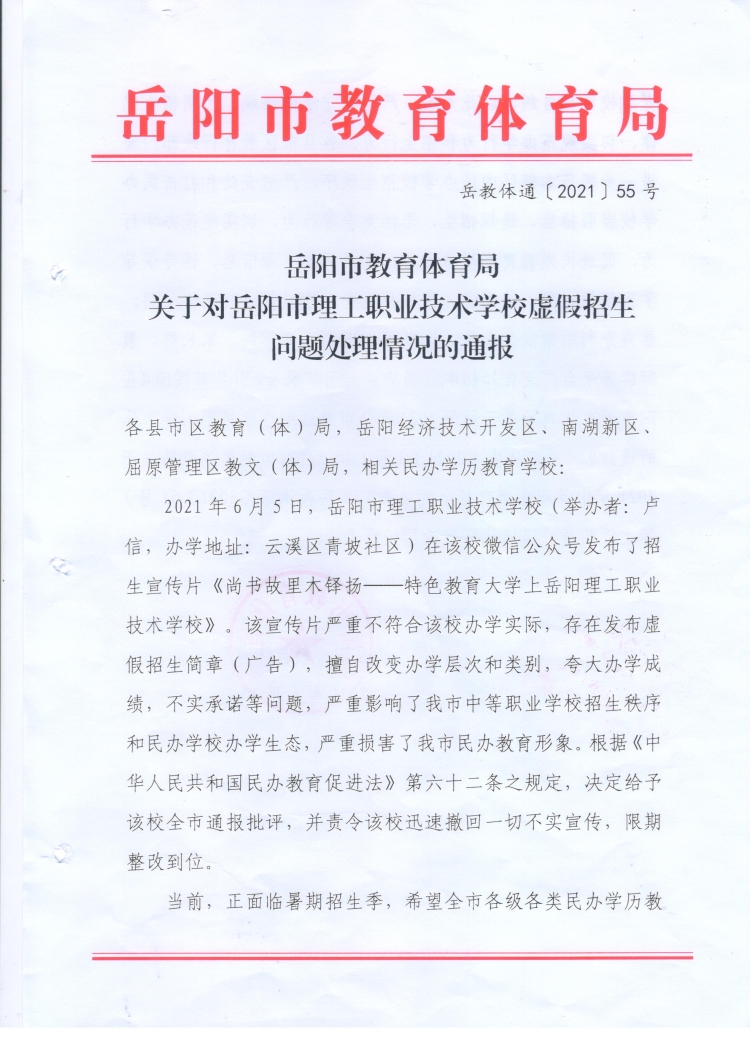 2021.6.23关于对岳阳市理工职业技术学校虚假招生问题处理情况的通报
