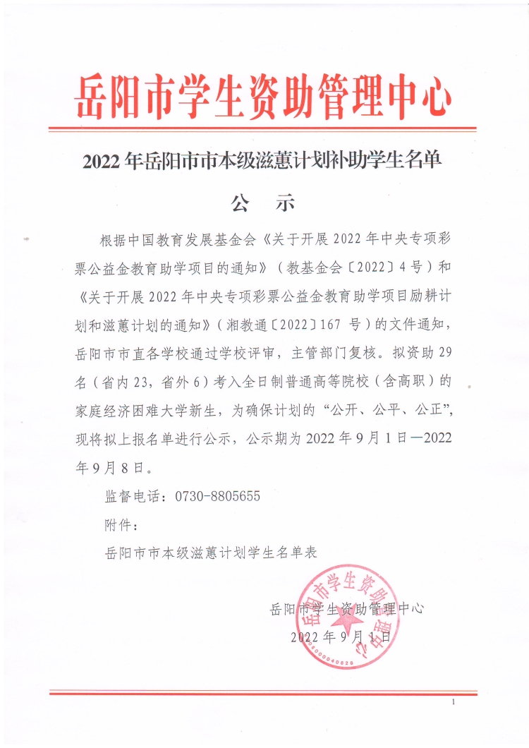 关于2022年岳阳市市本级滋蕙计划补助学生名单的公示