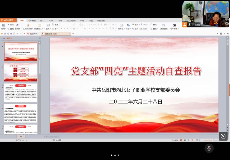 王玉梅书记代表党支部作《“四亮”主题活动自查报告》,她回顾了党支部亮旗帜、组织生活亮规矩、党员示范亮身份、党建阵地亮形象“四亮”工作取得的成绩,指出了问题和不足,明确了努力方向和工作重点,列出了整改清单与措施,并代表支部认真听取党员同志的建议。