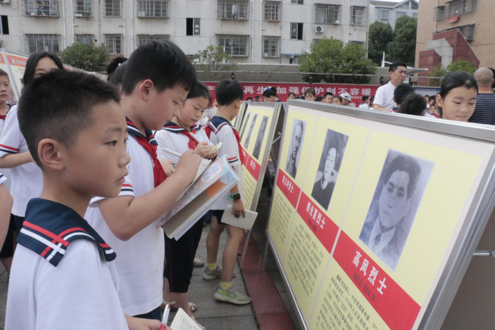 革命烈士生平及事迹展板前,师生们缅怀革命先烈,追述一位位华容县革命先辈光荣事迹,感受他们舍生忘死、浴血奋战的革命精神,感悟现今幸福生活的来之不易。