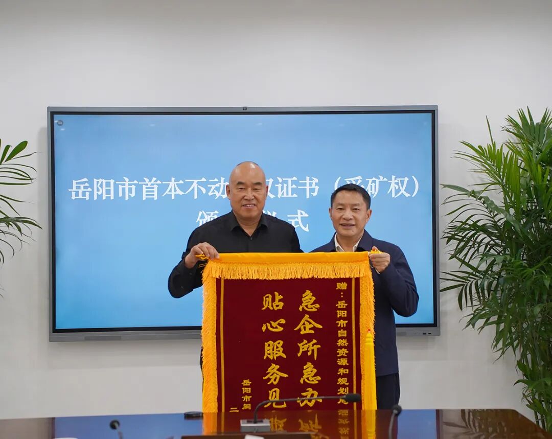 11月5日,岳阳市自然资源和规划局举行岳阳市首本不动产权证书(采矿权)颁发仪式,市自然资源规划局党组书记、局长许淞为岳阳市闽瑞石业有限公司颁发采矿权不动产权证书和采矿许可证书。