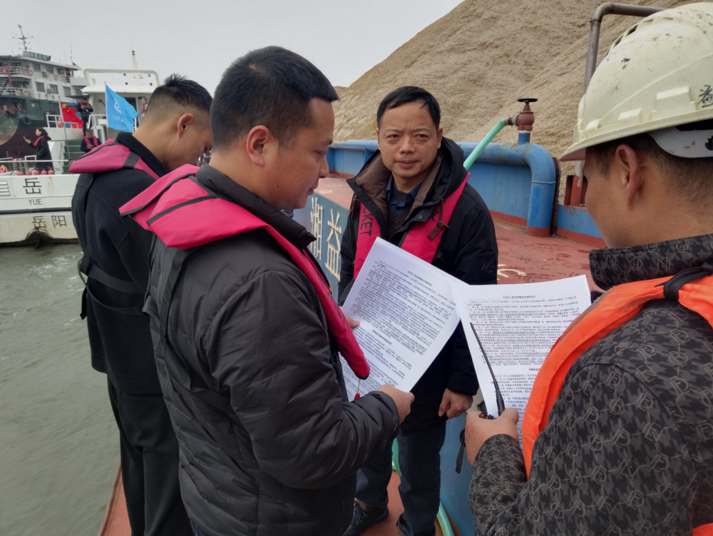 联合巡江队伍乘坐岳阳水政06公务船执法船从岳阳海事码头出发,经三江口前往长江云溪段水域开展巡查,重点检查河道管理范围内是否存在非法采砂、侵占河道、违法建设等涉河违法行为。在百盛锚地,巡江队伍现场检查了运砂船采运管理单、砂石过驳及过驳证明开具等情况,并通过发放宣传手册、现场解读等形式,向管理服务对象普及长江保护相关法律法规,提升社会公众对《中华人民共和国长江保护法》的知晓度、参与率和认同感,营造了守护长江母亲河、共建美丽幸福河湖的良好法治氛围。