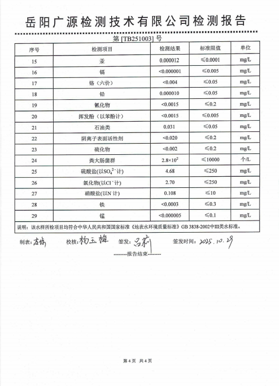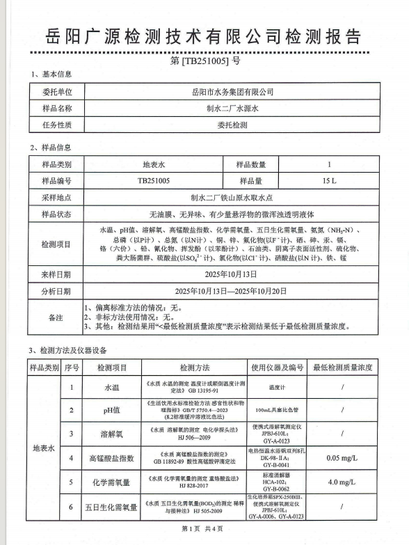 2025年10月岳阳市水务集团水源水水质检测月报表