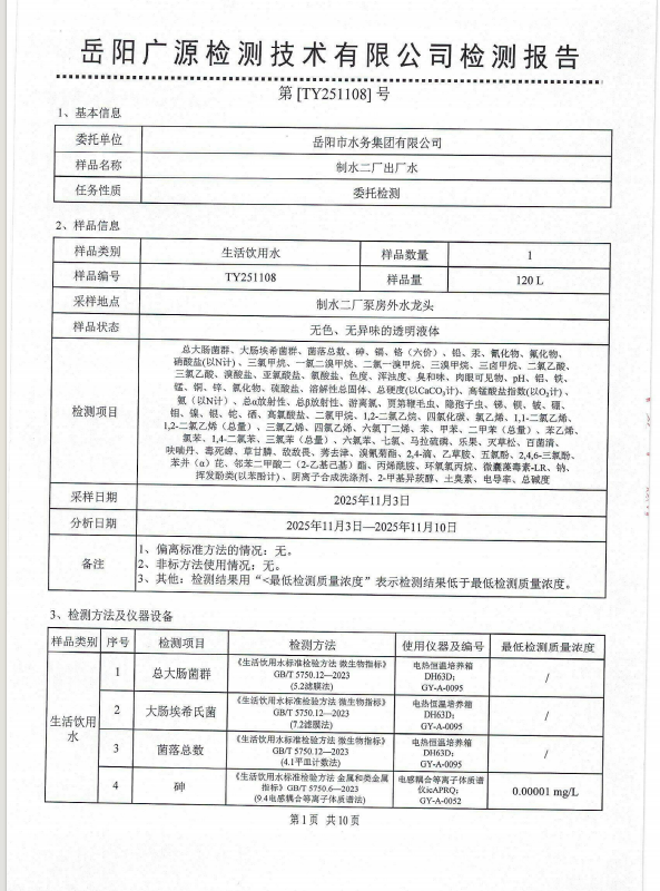 2025年11月岳阳市水务集团出厂水水质检测月报表