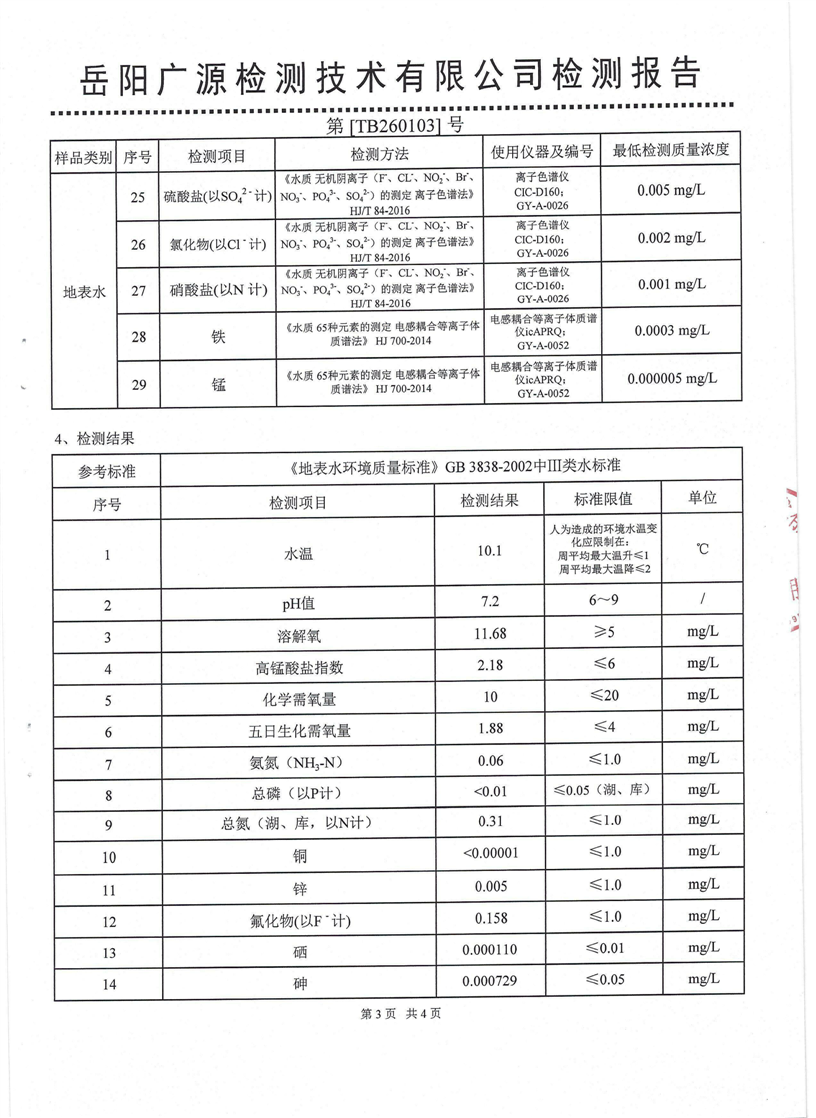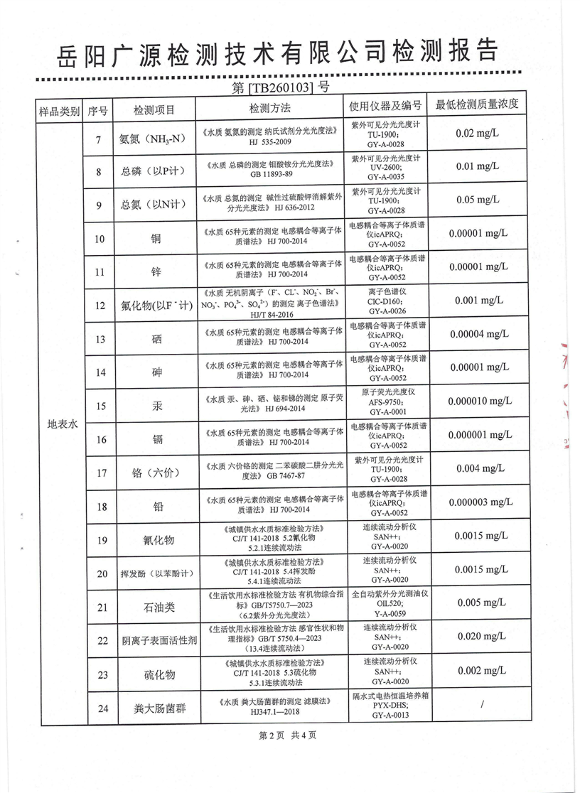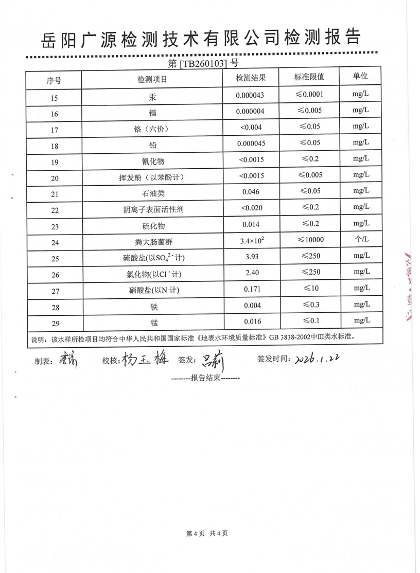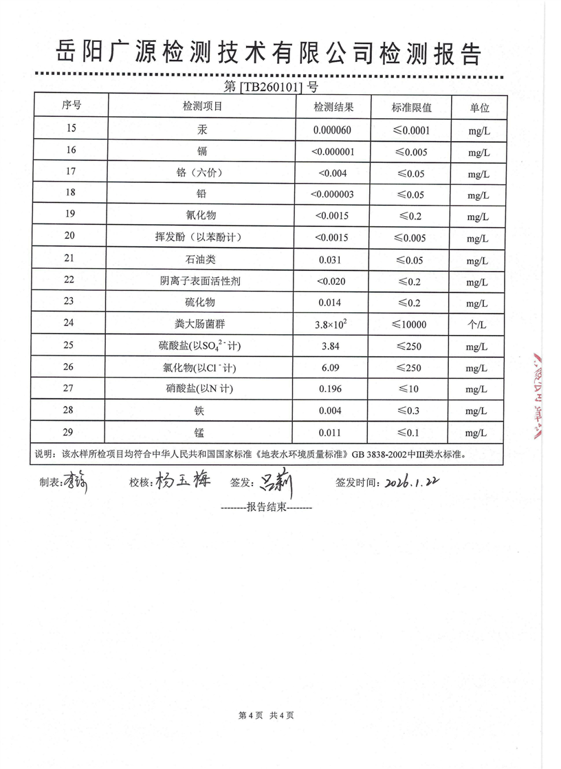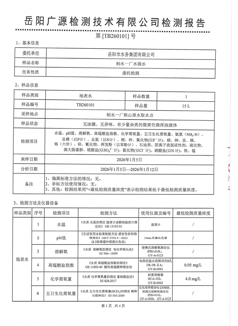 2026年1月岳阳市水务集团水源水水质检测月报表