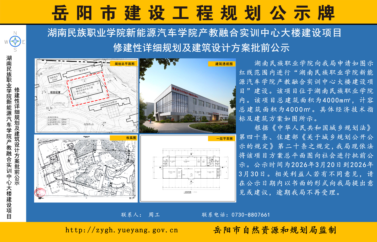 湖南民族职业学院新能源汽车学院产教融合实训中心大楼建设项目修建性详细规划及建筑设计方案批前公示