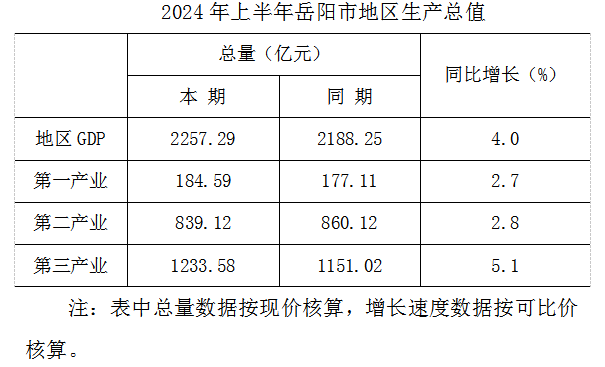 根据地区生产总值统一核算结果,2024年上半年岳阳市地区生产总值2257.29亿元,按可比价格计算,同比增长4.0%。分产业看,第一产业增加值184.59亿元,增长2.7%;第二产业增加值839.12亿元,增长2.8%;第三产业增加值1233.58亿元,增长5.1%。