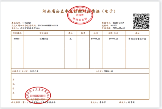2021年7月20日以来,河南多地遭遇极端强降雨,郑州、新乡等地发生严重内涝,无数房屋倒塌,道路冲毁、停水断电,物质短缺,灾区河南人民的生活健康短时间内难以得到保障。得知情况的第一时间,岳阳市健康管理协会党支部迅速行动起来,积极向协会会员单位发出捐款捐物援助倡议。8月1日,协会会员单位湖南康福来医药有限公司以“健康的名义”,向河南灾区捐助伍万元用于灾区人民的灾后重建。