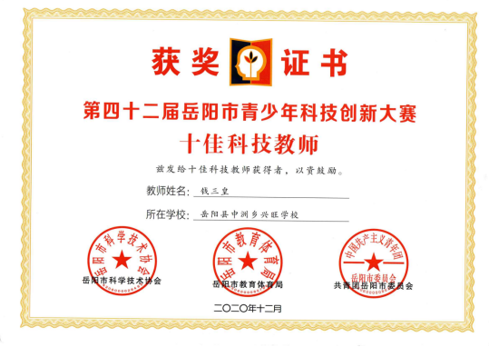 钱三皇,副高级科学教师、湖南省科普作协委员、岳阳市青少年科技教育协会理事、中国教育专家网教育名师、中国好老师、中国发明协会中小学创造教育分会第2届创新实践六强名师、第2届湖南师范大学枫叶基金优秀乡村教师奖、第4届汀汀教师奖、湖南省十佳科技教师、岳阳市第2届青年五四奖章获得者、岳阳市扎根基层优秀人才、岳阳市科协八大代表、岳阳市十佳科技教师、岳阳县名师。近年来带领学生开展科技创新教育,并取得了一定的成绩:共获得了全国、湖南省、岳阳市、岳阳县等各级各类竞赛荣誉证书228项。个人事迹得到了潇湘晨报、岳阳日报、岳阳县微巴陵、望巴陵的报道。