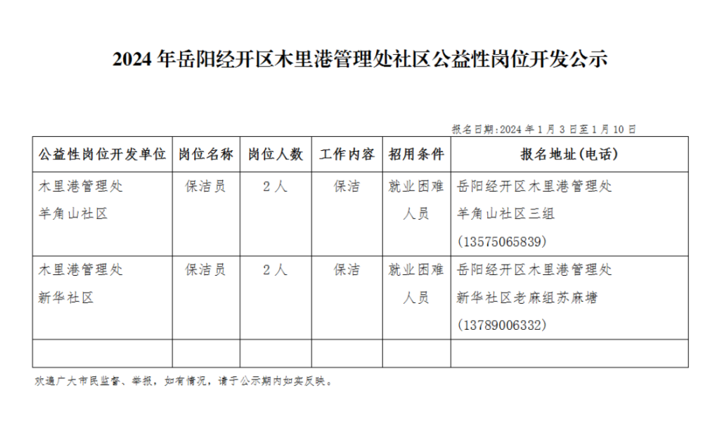 2024年岳阳经开区木里港管理处社区公益性岗位开发公示