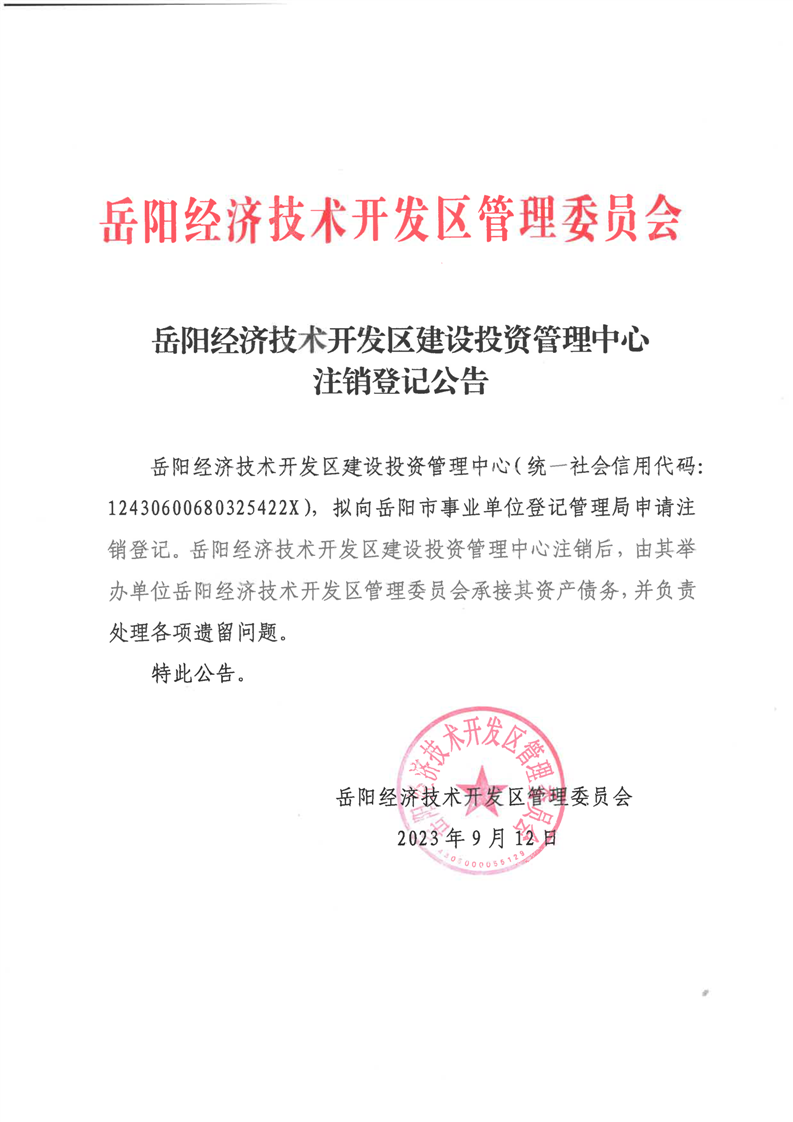 岳阳经济技术开发区建设投资管理中心注销登记公告
