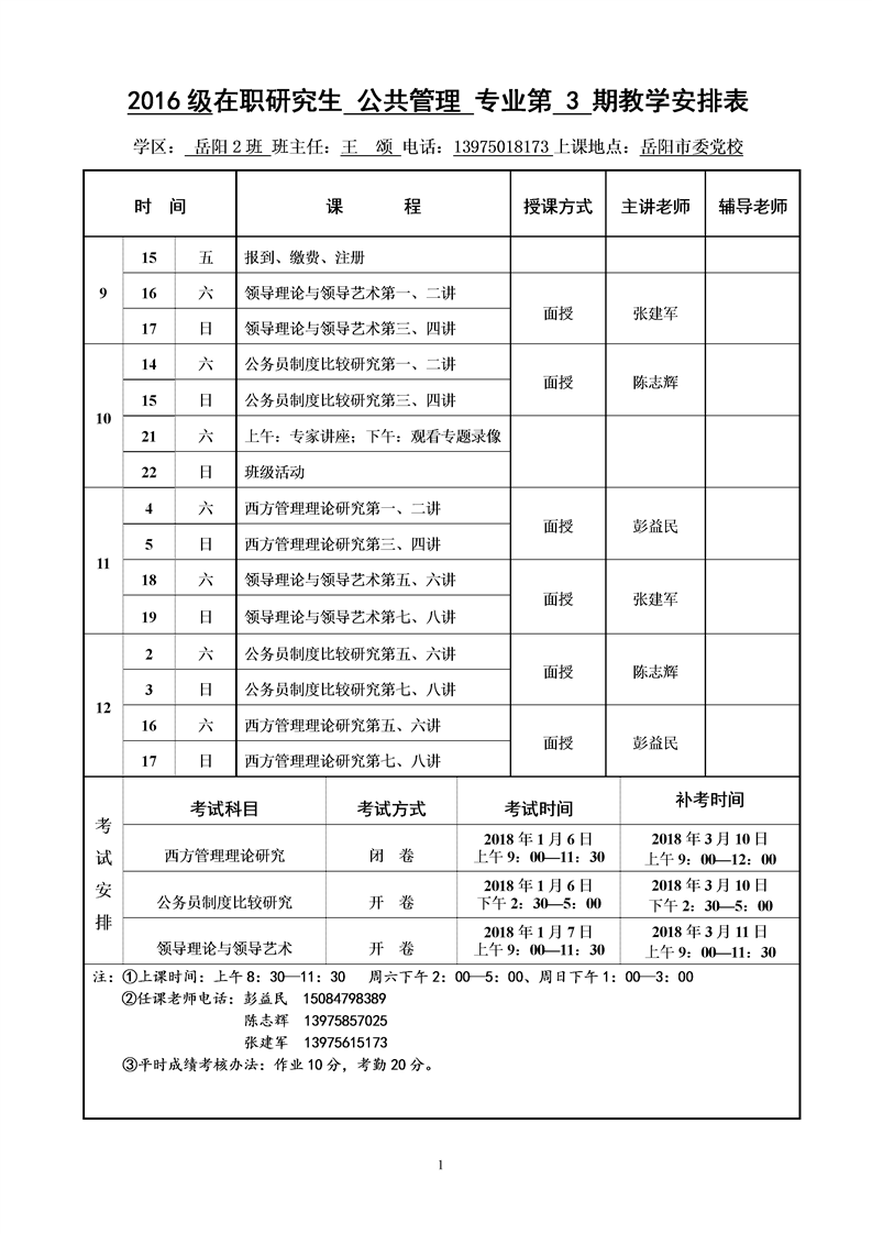 2016级在职研究生 公共管理 专业2班第 3 期教学安排表