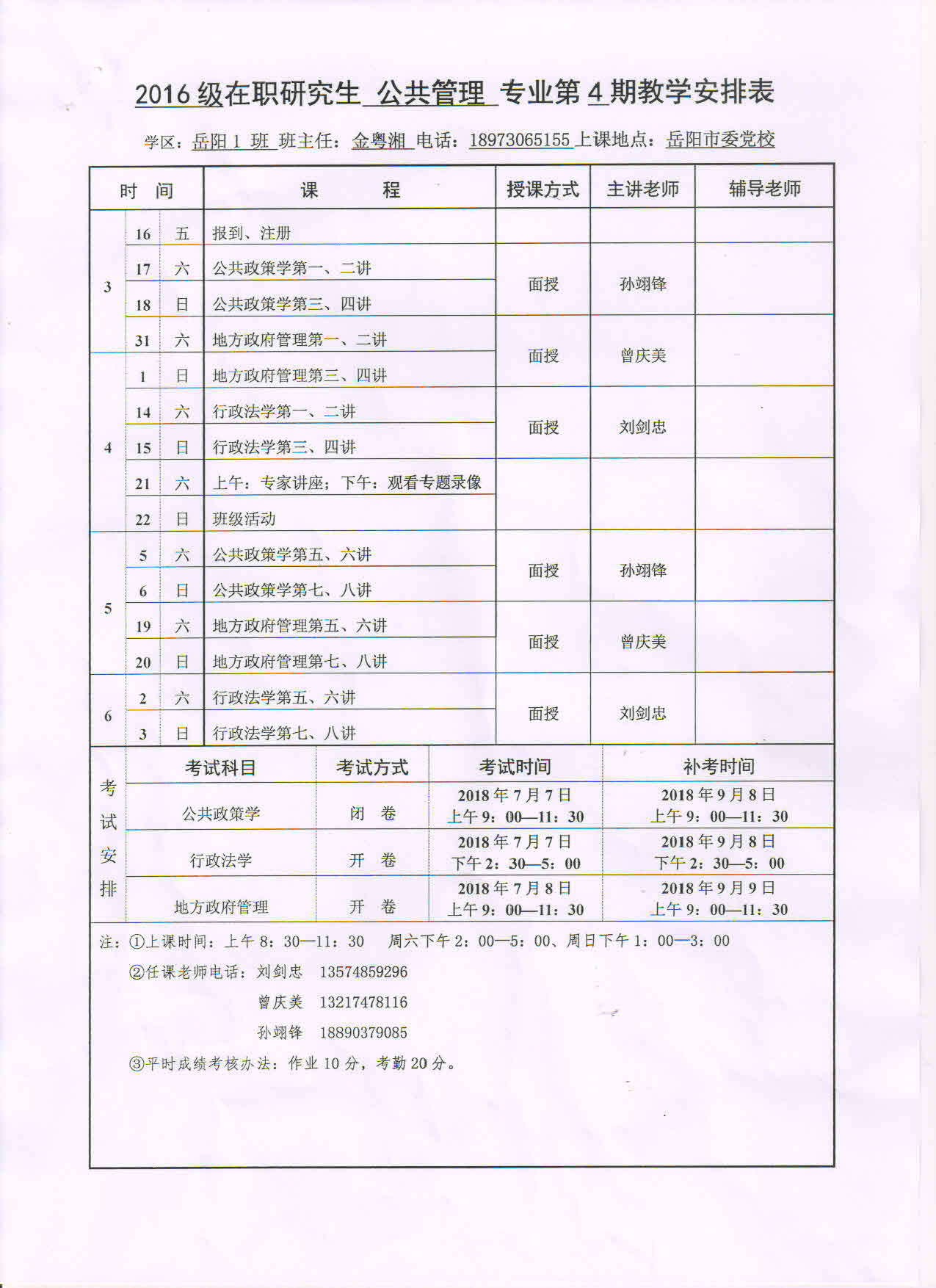 2016级在职研究生 公共管理 专业第4期教学安排表