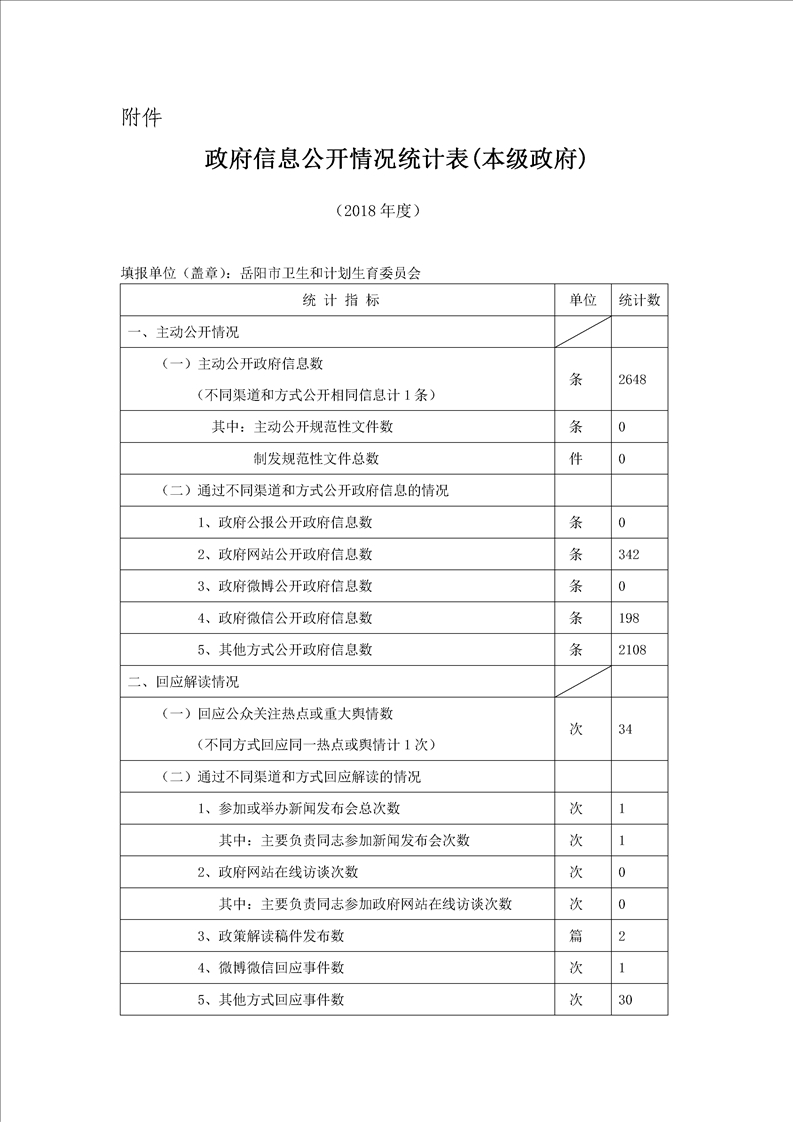 岳阳市卫生计生委2018年政府信息公开情况统计表