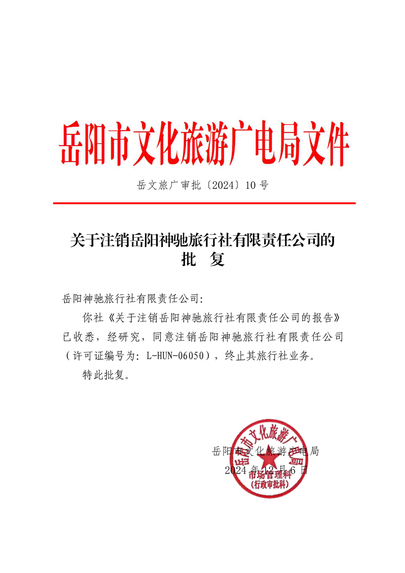 关于注销岳阳神驰旅行社有限责任公司的批复