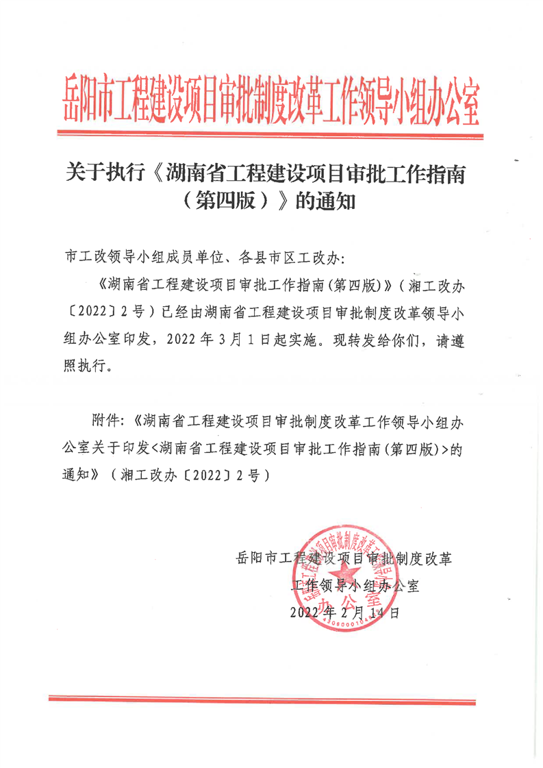 岳阳市工改办关于执行《湖南省工程建设项目审批工作指南(第四版)》的通知