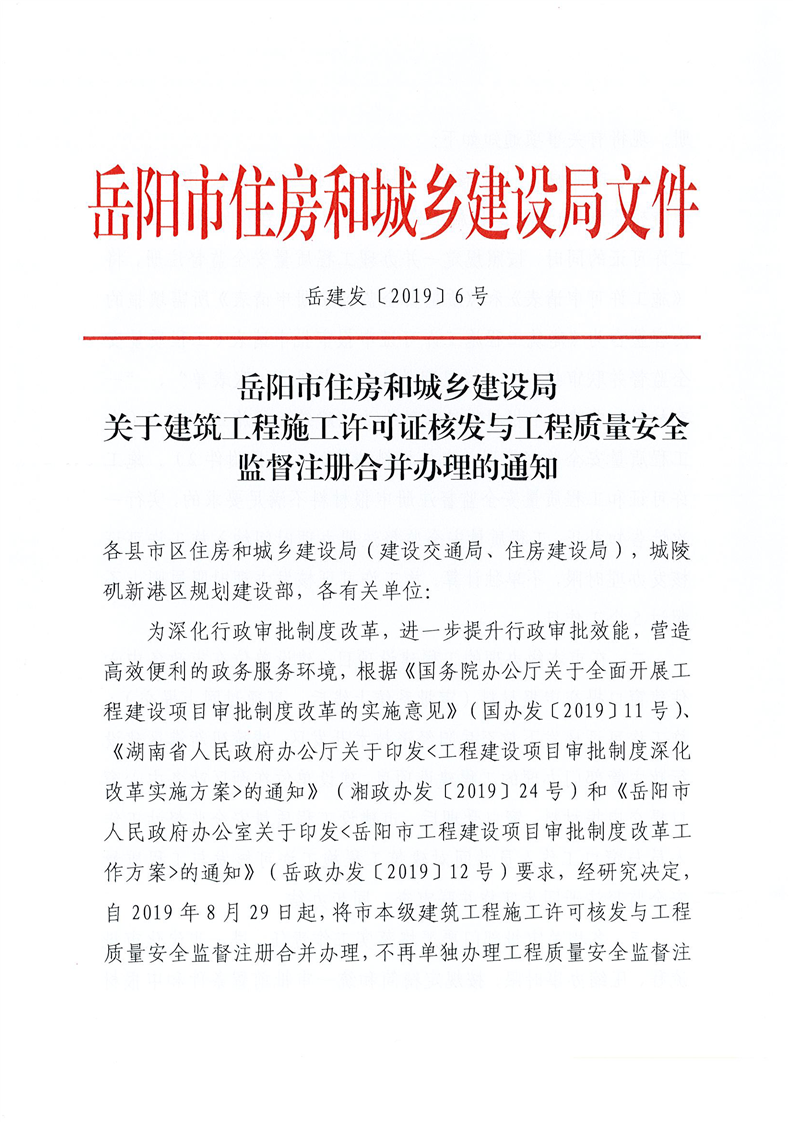 岳阳市住房和城乡建设局《关于建筑工程施工许可证核发与工程质量安全监督注册合并办理》的通知