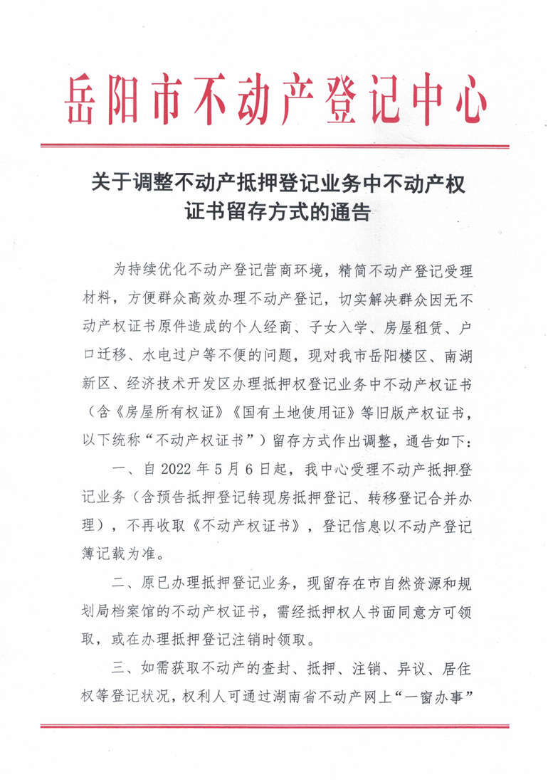 关于调整不动产抵押登记业务中不动产权证书留存方式的通告